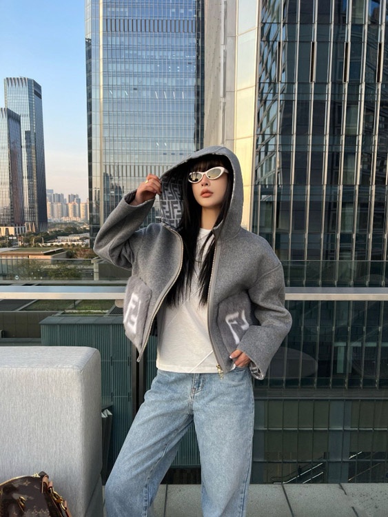 Fendi new wool blend zip-up hooded short jacket-5378